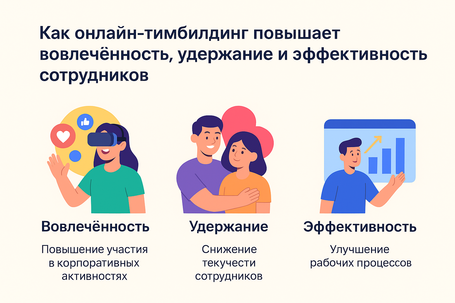 Онлайн-тимбилдинги ускоряют процесс знакомства и снижают стресс новичков, улучшая показатели удержания.
